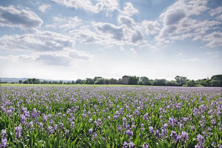 Bien qu’originaire d’Extrême-Orient, l’iris est aujourd’hui principalement cultivé en Italie et au Maroc. L’absolue d’iris provient d’une extraction par solvant volatil de racines broyées. Ce processus commence après trois ans de croissance : les racines sont épluchées, lavées et séchées au soleil ou dans un four à température modérée, tandis que les rhizomes sont traités toute l’année, séchés dans un four à 40 degrés pendant deux ans. Ils prennent un parfum de violette grâce à des cétones appelées irones. À l’étape suivante, ils sont broyés et distillés à la vapeur pour créer le beurre d’iris, parfois aussi appelé « béton d’iris ». Avec un processus d’extraction aussi long et compliqué et un rendement aussi faible, son prix élevé s’explique facilement. La variété Iris Padilla atteint plus de 100 000 euros le kilo ! Le rendement des rhizomes broyés est de 0,2 à 0,4 %. Durant le processus de purification, l’élimination des acides gras permet de créer l’absolue.